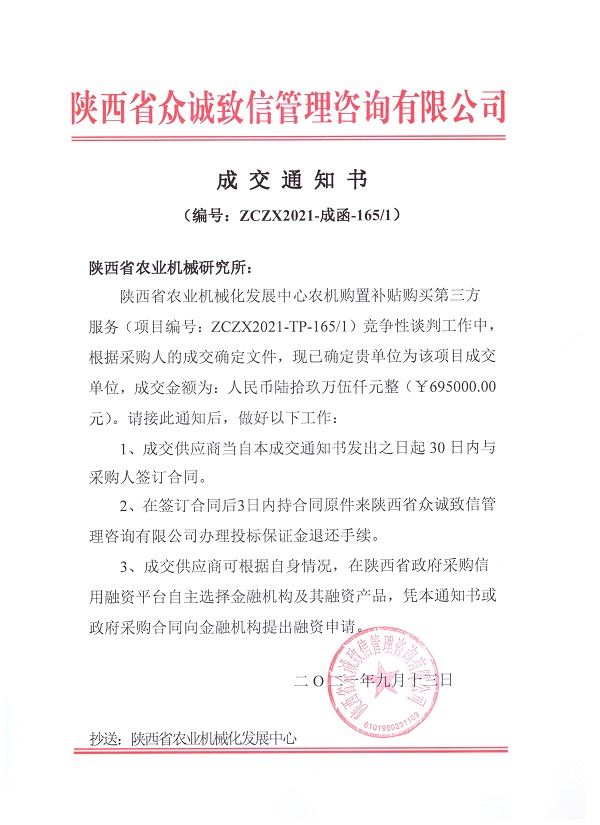 根據(jù)陜西省農(nóng)業(yè)機械化發(fā)展中心農(nóng)機購置補貼購買第三方服務競爭性談判公告(項目編號:ZCZX2021-TP-165/1),我所迅速組織人員團結(jié)協(xié)作,高效地完成了響應文件的編制,并按期遞交至陜西省眾誠致信管理咨詢有限公司。最終經(jīng)談判小組評審推薦,確定我所為該項目供應商。