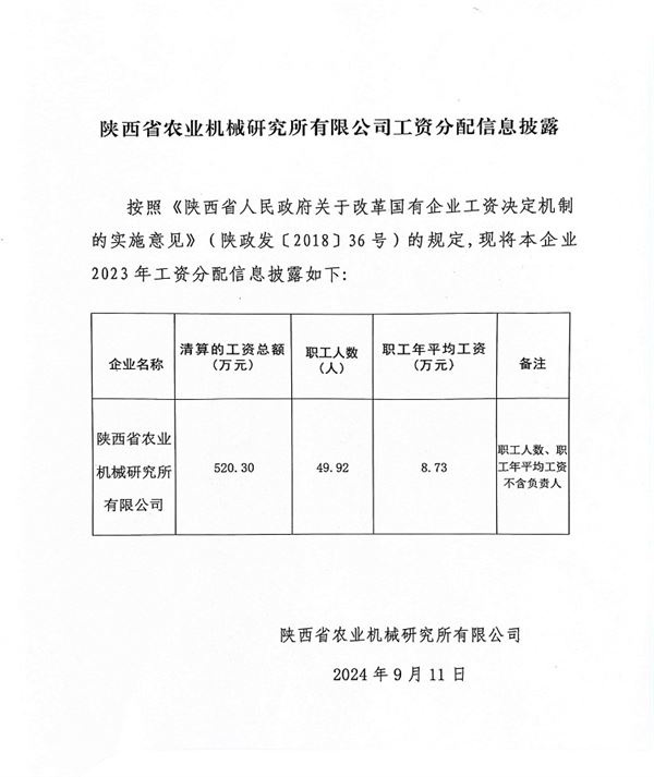 陜西省農(nóng)業(yè)機械研究所有限公司工資分配信息披露