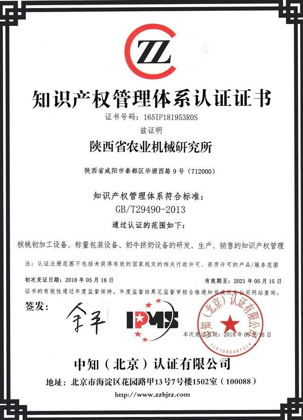 2018年5月16日,陜西省農(nóng)業(yè)機(jī)械研究所順利通過了中知(北京)認(rèn)證有限公司知識產(chǎn)權(quán)管理體系審核,并頒發(fā)了知識產(chǎn)權(quán)管理體系認(rèn)證證書。
